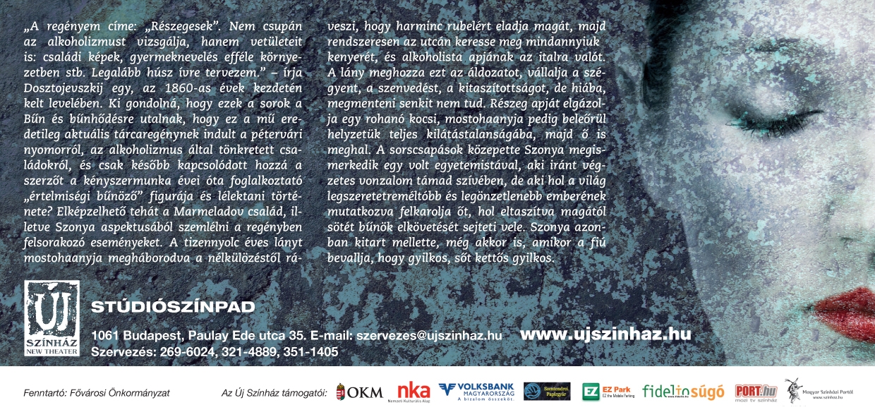 „A regényem címe: „Részegesek”. Nem csupán az alkoholizmust vizsgálja, hanem vetületeit is: családi képek, gyermeknevelés efféle környezetben stb. Legalább húsz ívre tervezem.” – írja Dosztojevszkij egy, az 1860-as évek kezdetén kelt levelében. Ki gondolná, hogy ezek a sorok a Bűn és bűnhődésre utalnak, hogy ez a mű eredetileg aktuális tárcaregénynek indult a pétervári nyomorról, az alkoholizmus által tönkretett családokról, és csak később kapcsolódott hozzá a szerzőt a kényszermunka évei óta foglalkoztató „értelmiségi bűnöző” figurája és lélektani története? Elképzelhető tehát a Marmeladov család, illetve Szonya aspektusából szemlélni a regényben felsorakozó eseményeket. A tizennyolc éves lányt mostohaanyja megháborodva a nélkülözéstől ráveszi, hogy harminc rubelért eladja magát, majd rendszeresen az utcán keresse meg mindannyiuk kenyerét, és alkoholista apjának az italra valót. A lány meghozza ezt az áldozatot, vállalja a szégyent, a szenvedést, a kitaszítottságot, de hiába, megmenteni senkit nem tud. Részeg apját elgázolja egy rohanó kocsi, mostohaanyja pedig beleőrül helyzetük teljes kilátástalanságába, majd ő is meghal. A sorscsapások közepette Szonya megismerkedik egy volt egyetemistával, aki iránt végzetes vonzalom támad szívében, de aki hol a világ legszeretetreméltóbb és legönzetlenebb emberének mutatkozva felkarolja őt, hol eltaszítva magától sötét bűnök elkövetését sejteti vele. Szonya azonban kitart mellette, még akkor is, amikor a fiú bevallja, hogy gyilkos, sőt kettős gyilkos.