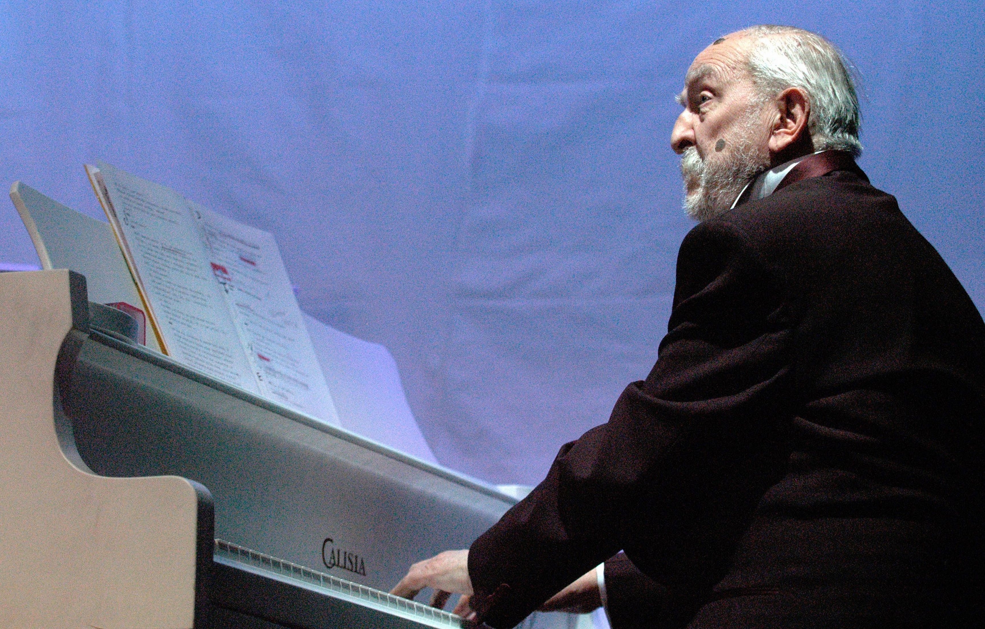 It can be said that Bogusław Schaeffer is one of our times biggest Polish artists. According to his qualification and vocation, he is both a composer and theorist of music. Even so, his plays are received almost as well as (if not even better than) his musical compositions. In Poland he is one of the most often staged living writers, despite of his not letting his plays be published. Here in Hungary his name is still unfortunately mostly unknown, even though his life’s work (about 400 musical compositions, 17 books and 44 stage works) have already been translated into seventeen of the world’s languages. Interpretation of Schaeffer’s musically charged stage work is extremely hard, if we try to analyze it according to conventional theatrical ideas and dramatic „plot”. If we want to try to understand his work without losing our way in interpretation, we should examine it through the laws of music instead. (Patrícia Pászt: Contemporary Polish Drama)