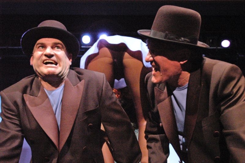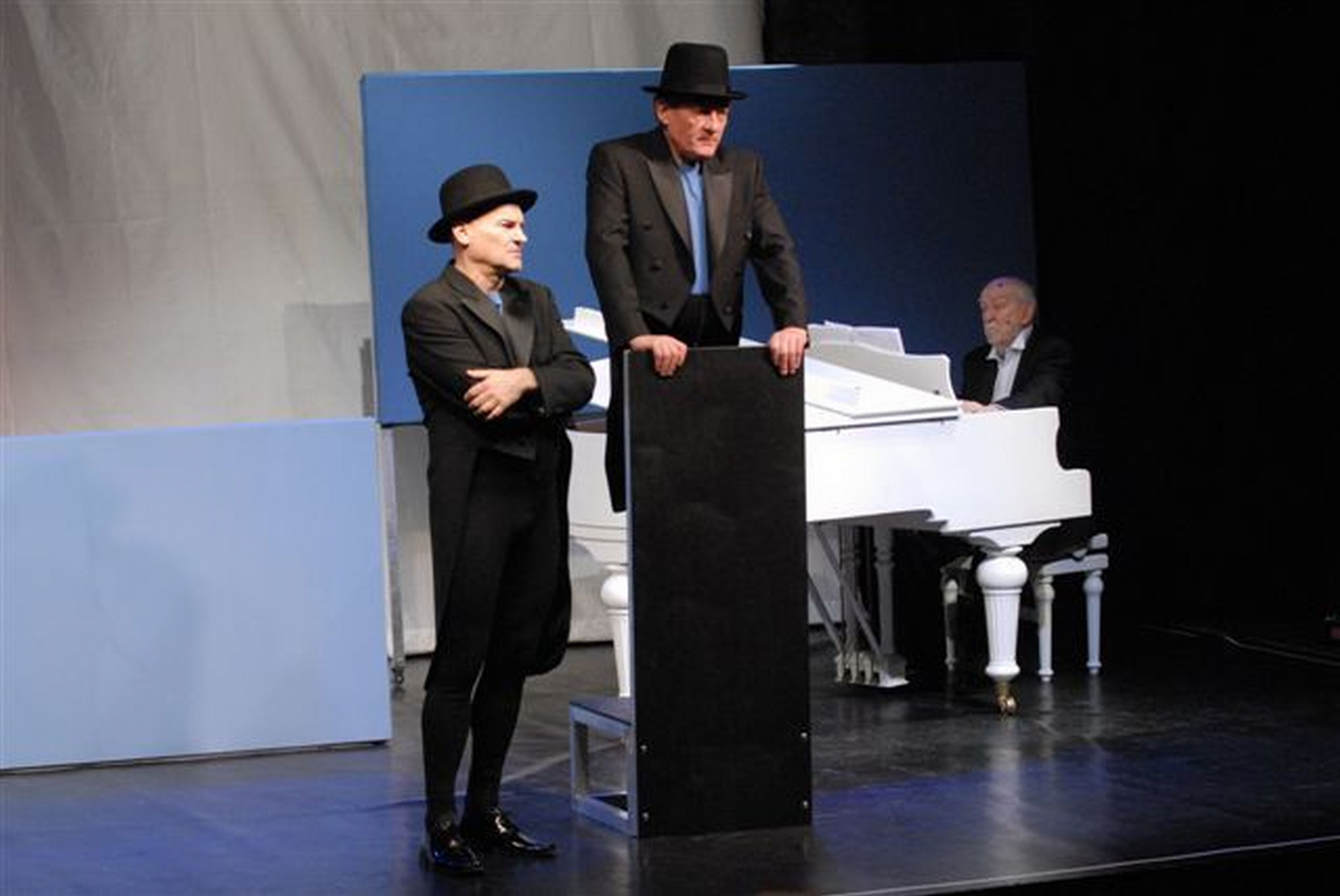 „What the title suggests is all that it can convey. This is a theatrical something, something for the theatre and most of all for the ‘schaefferian’ actor. The pianist and the kind woman are a welcome plus, but it must be stressed, that without them the play cannot be what it should be: a night-long spectacle. Like in my previous plays, an actor reads his part aloud, while trying to interpret what he can of it. But if he is inspired, he will do this without the text, like a good musician, who knows the piece by heart but has sheet music in front of him anyway. The piece begins by the text being read aloud, but slowly departs from it, so that only what is interesting remains. Jan Peszek read the playscript the first time, but could only say it without reading after many, many tries at interpretation, almost one thousand and one hundred in number. Sometimes he seems to return to reading his tattered text the way the plot was thought up at that time (and has since perhaps grown together with said text). Meanwhile, Marek Frąckowiak and Waldemar Obłoza can do pretty much whatever they want, within the limits of intellectual and aesthetic canon.” (Bogusław Schaeffer)