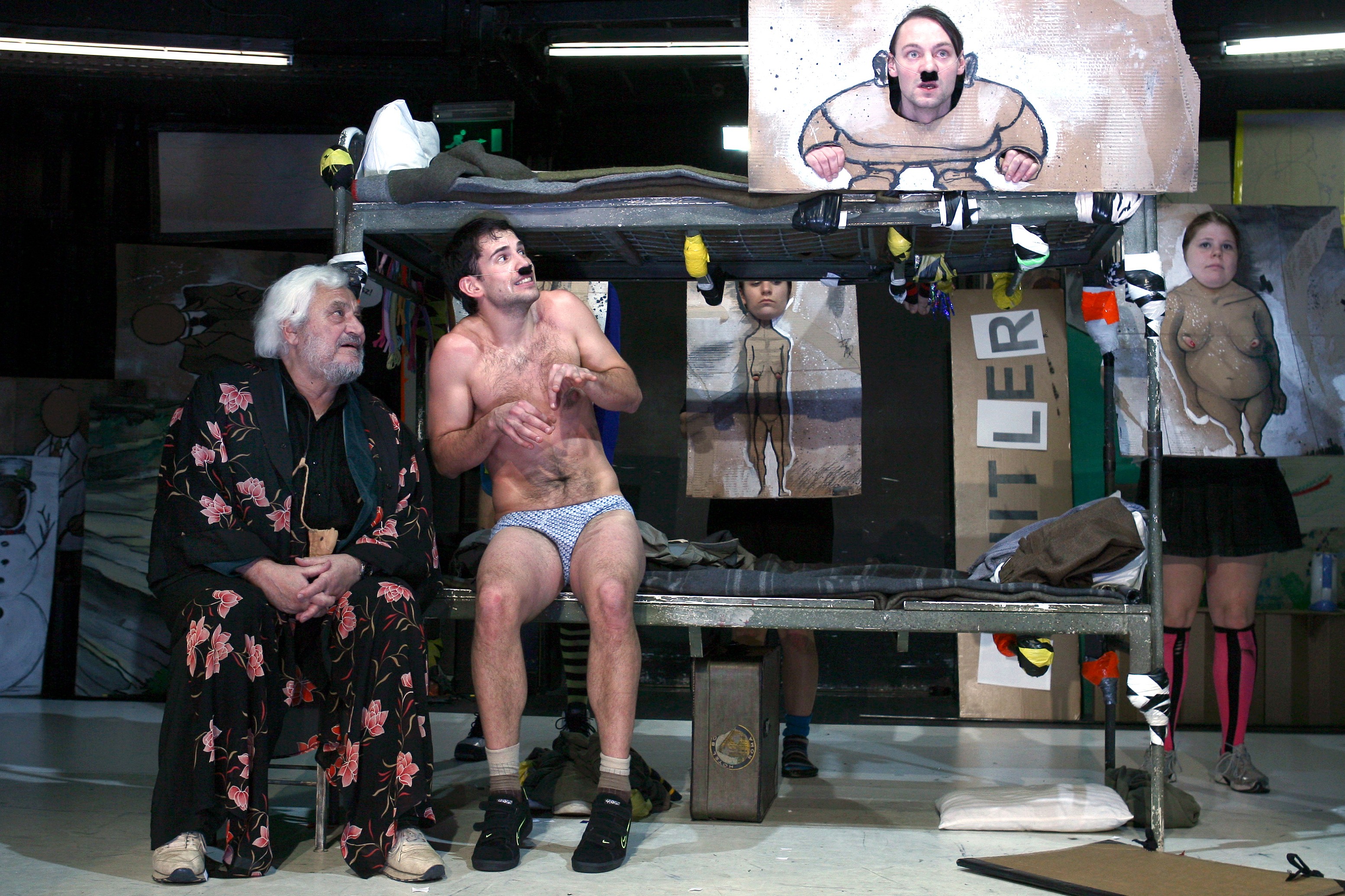 George Tabori sohasem volt magyar drámaíró, bár Tábori Györgyként látta meg a napvilágot 1914-ben Budapesten. Fiatalon költözött Berlinbe, ahonnan zsidó származása miatt Angliába, majd az Egyesült Államokba menekült a náci uralom idején. Az 1970-es évektől kezdődően visszatért a német nyelvterületre, és számos díjjal honorált dráma- és forgatókönyvírói tevékenységét kiegészítette a kísérleti színházcsinálással is 2007-ben bekövetkezett haláláig. Mein Kampf című darabja arra a Hitlerre koncentrál, aki alig azonos a náci rémmitológia hírhedett vezéralakjával. A lineáris, mégis sajátosan szabdalt dramaturgiával építkező történetben az ifjú Adolf érkezik Bécsbe festőkarrierjét elindítani, akit a tömegszálláson egy zsidó könyvkereskedő, Schlomo Herzl vesz pártfogásába. Kettejük kapcsolatában az írói megközelítés szerint a bölcs zsidó válik meghatározóvá: metafizikus gegek sorozatán át óvja-tanítja, és „irányítja” Hitlert a harca felé. A kultúrtörténeti és történelmi szellemességgel áthatott farce komoly pillanatoknak sincs híján; Tabori súlyos szimbólumrendszert mozgat hatalmas játékkedvvel a holocaust és a halál témakörében. Egyéni hangvételét éppen a kettő bravúros egymásba csúszásából nyeri, ahogyan a történelmi tények ismeretében baljós tartalmak egy clown-duó ártatlan játszadozásának tűnnek a darab történetének idejében. Tabori a „Great Love Story – Hitler and His Jew” cimkével aggatta fel darabját, s ezt a sajátos „ragaszkodást” Rába Roland képregényszerű formai megoldásokat felvonultató rendezése a szereposztás életkorainak ellenpontozásával erősíti meg. Két színészi generáció összekapcsolásával olyan gonoszkodásokkal is színezett, de eltéphetetlen ragaszkodást jelenít meg, mint egy unoka-nagyszülő kapcsolatban, valamint jelzi az Alföldi Róbert igazgató által megújított Nemzeti Színházi koncepcióját is: nem elvetni, hanem újra gondolni kell a hagyományt.